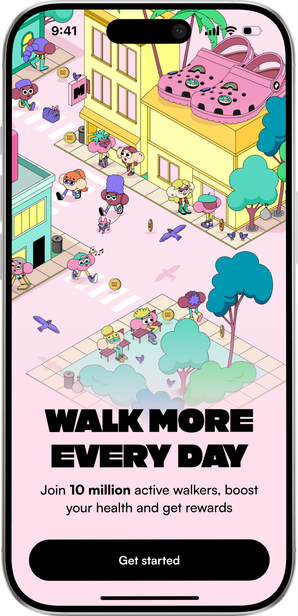 1. Download the app (from App Store or Google Play) and sign up. 2. Walk (outdoors or indoors); the more steps, the more coins you earn. 3. Show additional ways to earn: complete challenges, collect coins on the map, hit streaks, play in-app games, watch ads, answer surveys. 4. Show coins accumulate in your virtual wallet and the offers available for cashout.